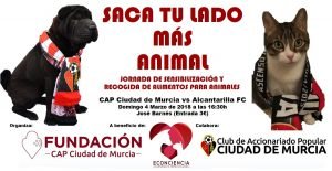A parte del partido, la Fundación CAP Ciudad de Murcia celebrará la jornada solidaria «Saca tu lado más animal» por la que se pretende sensibilizar sobre el problema del abandono de animales domésticos. Contaremos con la presencia de la protectora ECONCIENCIA que repartirá información sobre este problema y, además, se realizará una recogida solidaria para ayudar a la protectora en su labor. Puedes ayudar aportando pienso, trasportines, mantas, latas de comida húmeda, juguetes para animales, etc. ¡No te quedes en casa y el domingo colabora con nosotros!