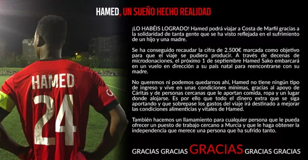 Según lo ya contabilizado y los ingresos que vienen en camino (tardan 3 días), más los que esperamos de varios clubes amigos, creemos que vamos a llegar a la cifra que nos marcamos, lo que sobrepase será para mejorar la estancia de Hamed Sako durante el mes que va a estar allí y para ayudarle en su día a día debido a su situación precaria. GRACIAS A TODOS.
