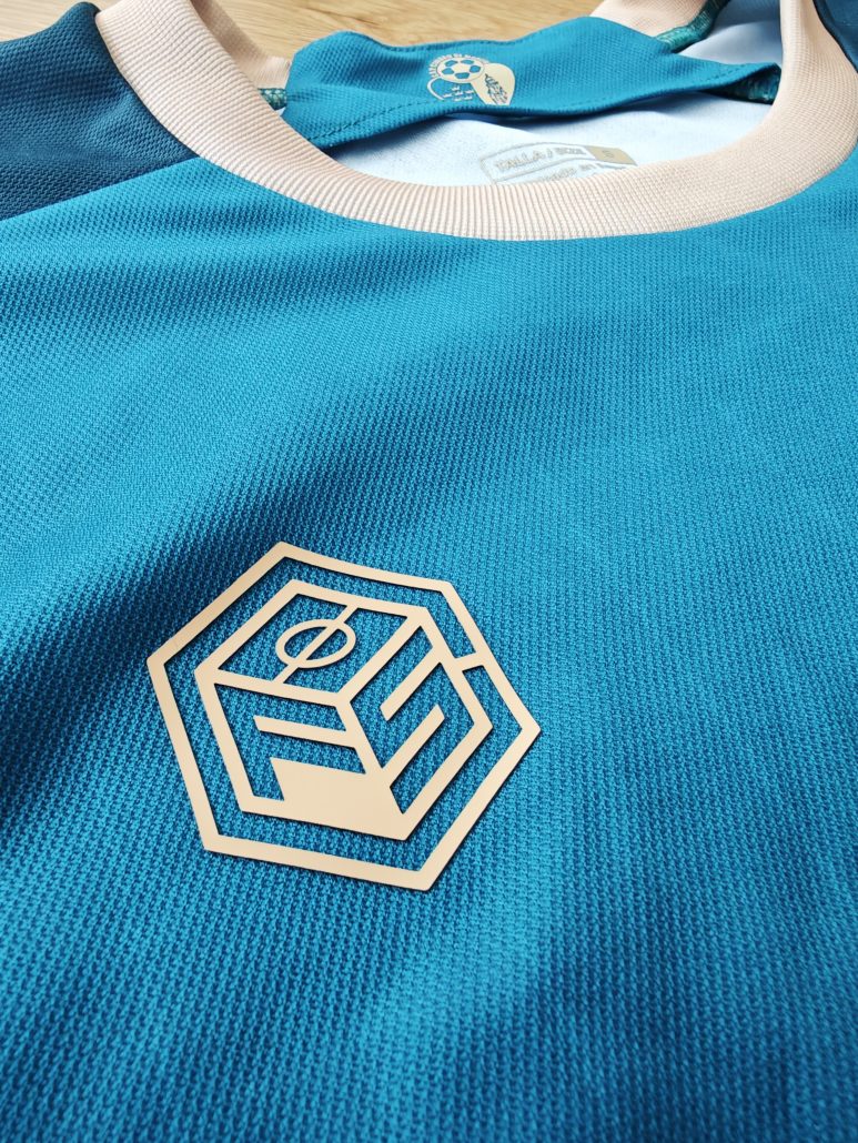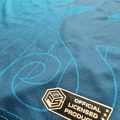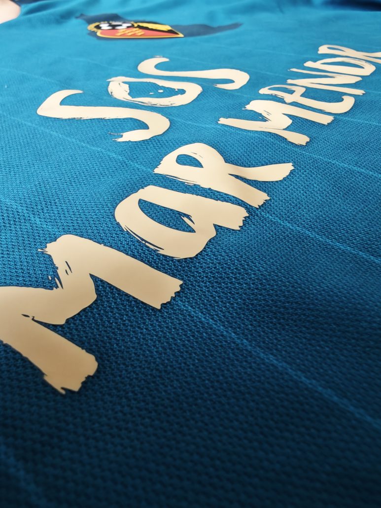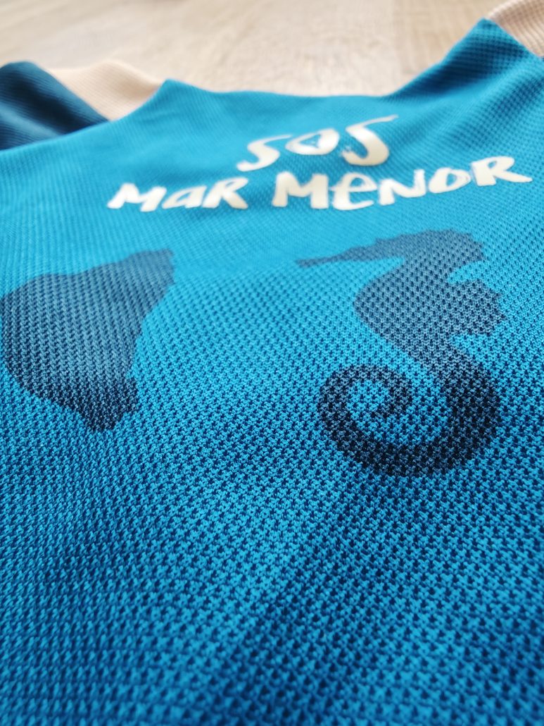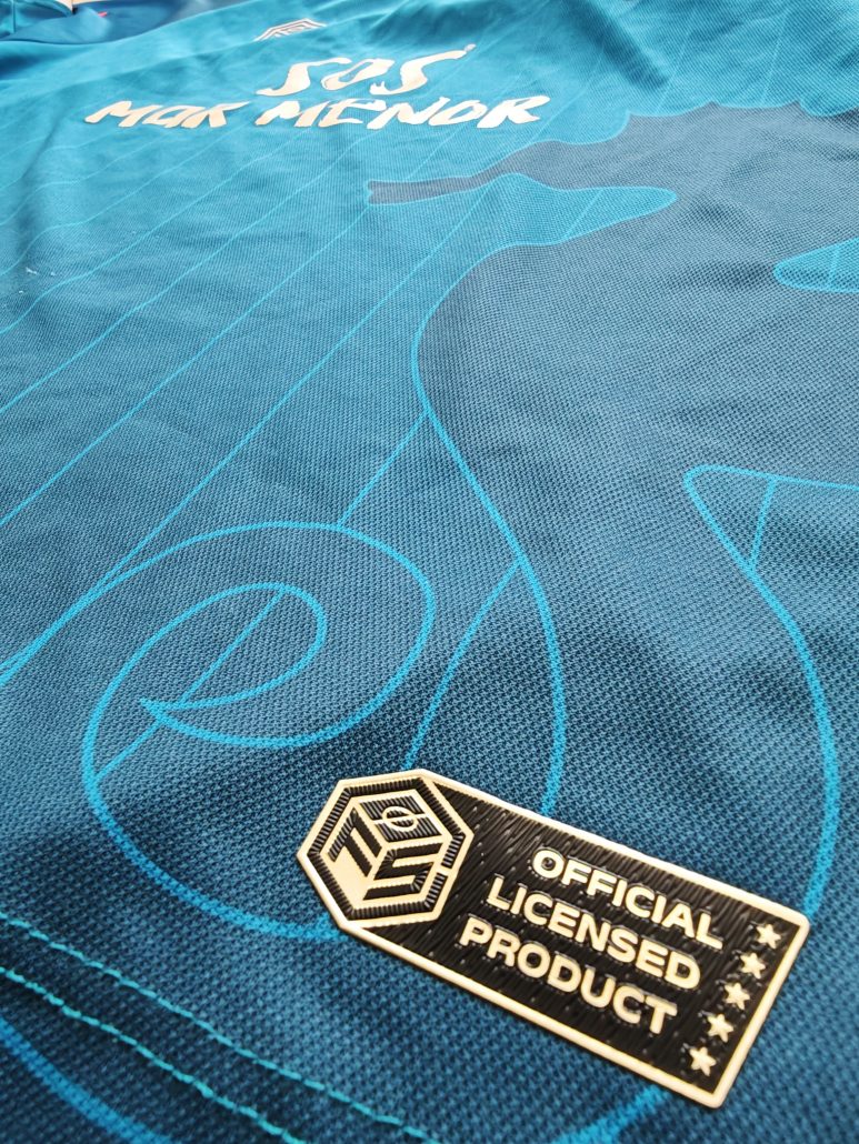 Camiseta Premium, de fabricación nacional con tela 100% poliéster reciclado promoviendo la sostenibilidad, escudos impresos en silicona 3D de alta calidad, «SOS Mar Menor» en vinilo elástico y etiqueta de producto licenciado.
