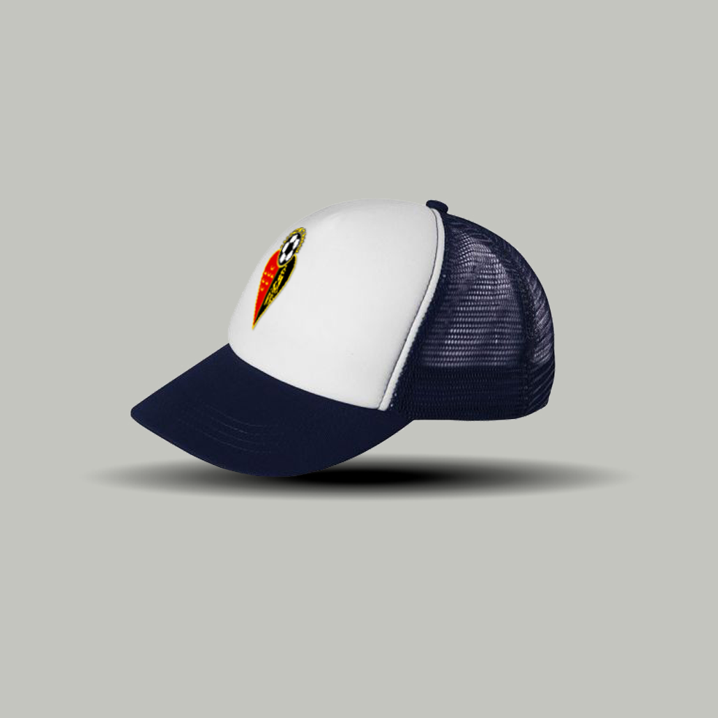Copa en tejido de rejilla transpirable, cierre solapado de material plástico, cinta interior antisudoral, cubrecosturas interiores del mismo tono que la prenda, visera a cuatro costuras y botón de adorno antioxidable.